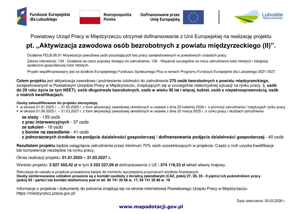 Projekt pn. „Aktywizacja zawodowa osób bezrobotnych z powiatu międzyrzeckiego (II)” #FunduszeEuropejskie